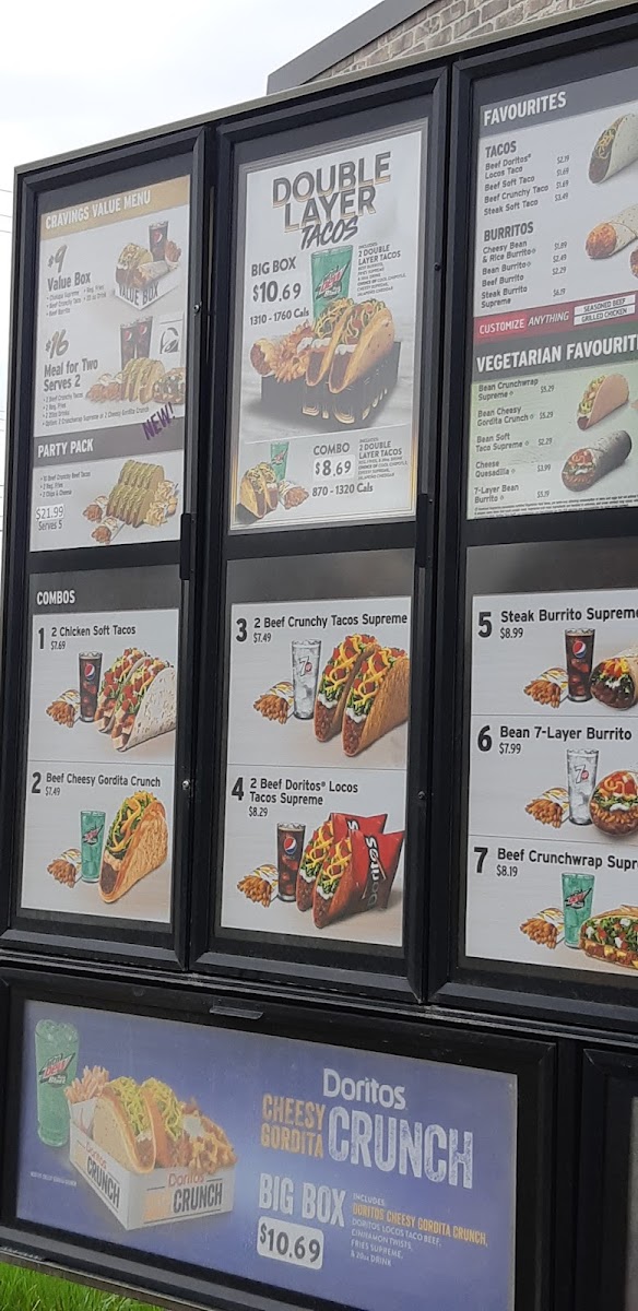 490-500 cal. A crunchy, Doritos Nacho Cheese taco shell filled with seasoned beef, lettuce, spicy ranch sauce, and real cheddar cheese, all wrapped up in a grilled flatbread filled with melted three-cheese blend.